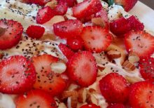 Waffles o pancakes con yogurt griego, frutillas, almendras y chia